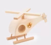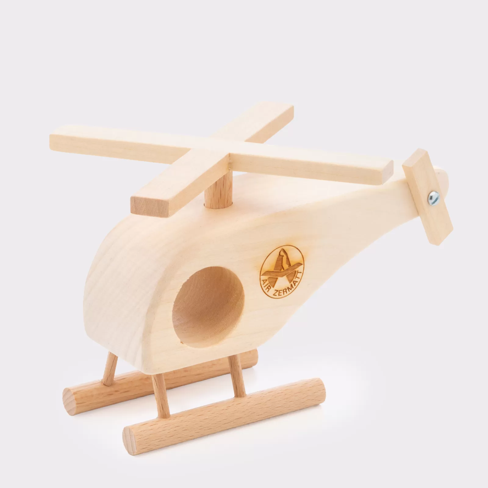 Handgefertigter Helikopter aus 100% FSC zertifiziertem Schweizer Holz, naturbelassen, aus dem Haus Trauffer Holzspielwaren AG in Hofstetten bei Brienz. Seitlich eingraviertes Logo Air Zermatt AG. Der Hauptrotor ist bei Lieferung nicht fixiert, kann aber falls gewünscht sehr einfach mit etwas Leim befestigt werden.