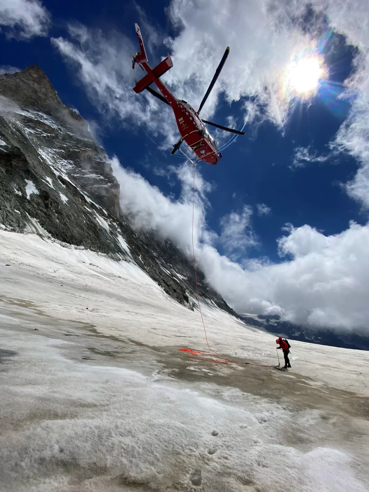 Finally, a 100-metre rope was stabilised on the helicopter with a 50-kilogram sack and flown to the exhausted mountain climbers. Together with the rescue specialist, the Air Zermatt crew successfully rescued the four climbers on the Matterhorn. They were exhausted but uninjured.
