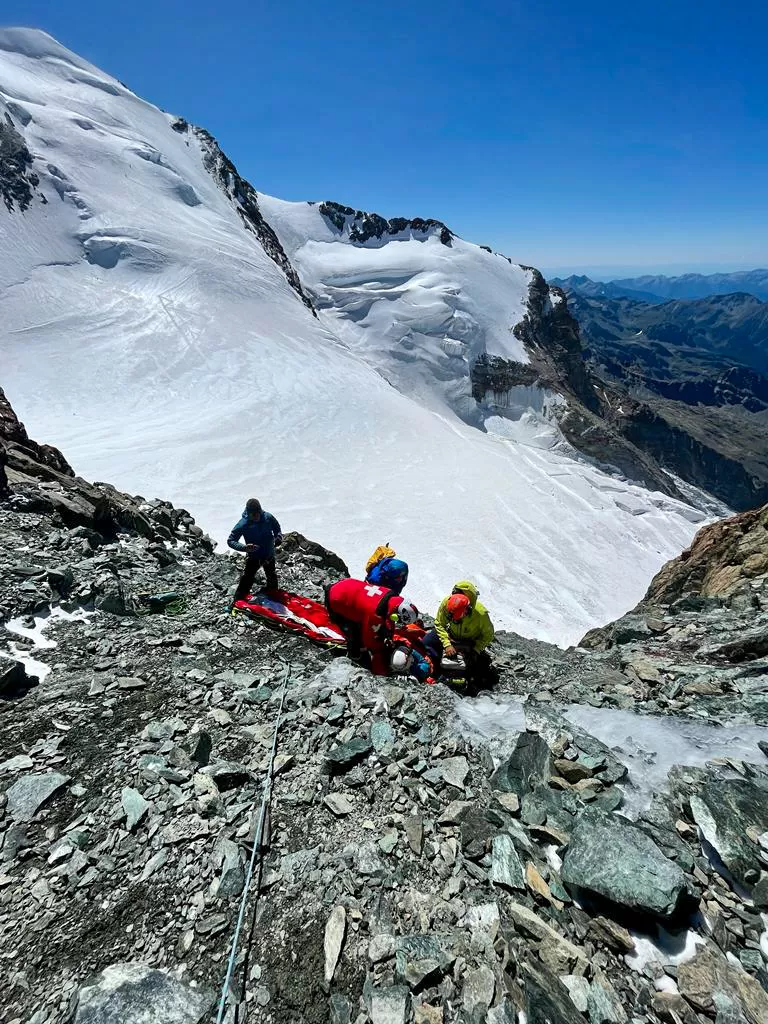 After the Italian air rescuers were forced to abort the air rescue, Air Zermatt was alerted. During the approach, the rescue crew noticed that two mountain guides from Zermatt, who heard cries for help, had already descended to the fallen climbers. They kept the casualties warm with insulating sheets. They also handed over their own guests to other mountain guides who were on the Pollux.