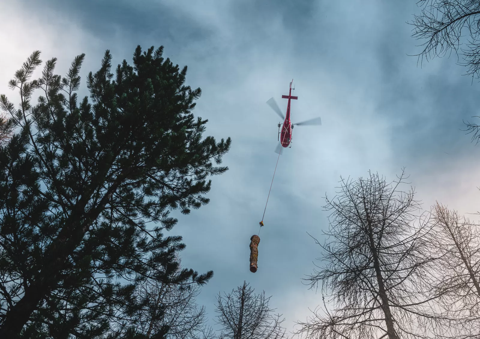 The heavy fresh snow also caused numerous trees to buckle, some of them on power lines or railway lines. Air Zermatt worked together with the regional forestry companies to remove the wood. These operations require precise coordination: while the pilot moved the wood in the air on a steel cable, the flight assistant on the ground instructed him by radio.