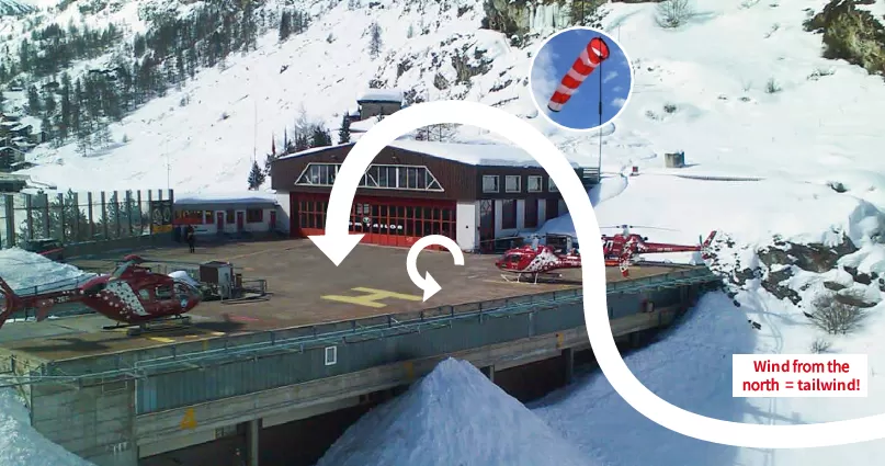 A briefing for the heliport in Zermatt was requested by the FOCA after it was increasingly observed that conventional approach procedures by pilots who were not familiar with the area led to dangerous situations due to steep approaches in the vortex area.